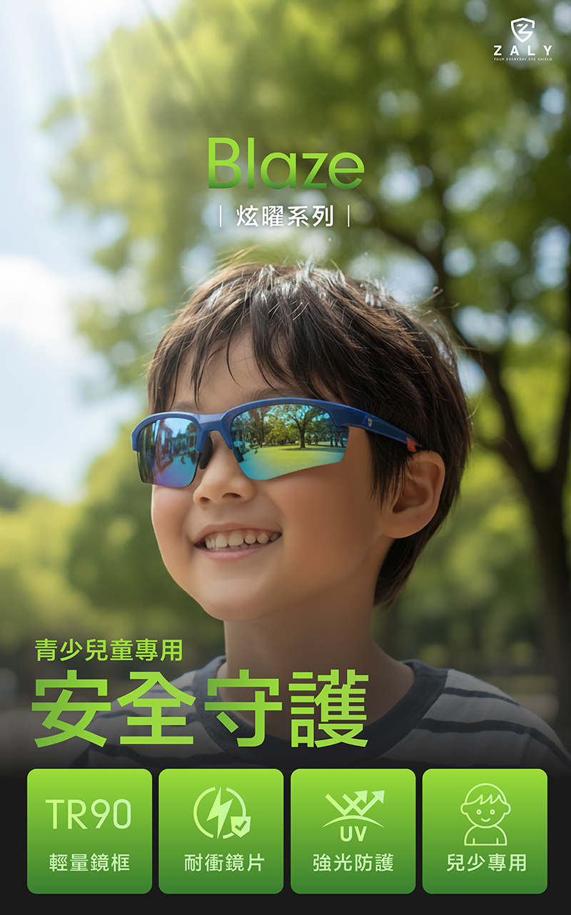 Blaze 炫曜系列運動太陽眼鏡,採用 TR90 輕盈高韌鏡框與 PC 耐衝擊鏡片,具備 Cat.3 戶外運動等級濾光與 99% 以上 UV 阻隔,並加上防潑水處理,適合放學玩耍、戶外課程與假日運動的青少兒童配戴。