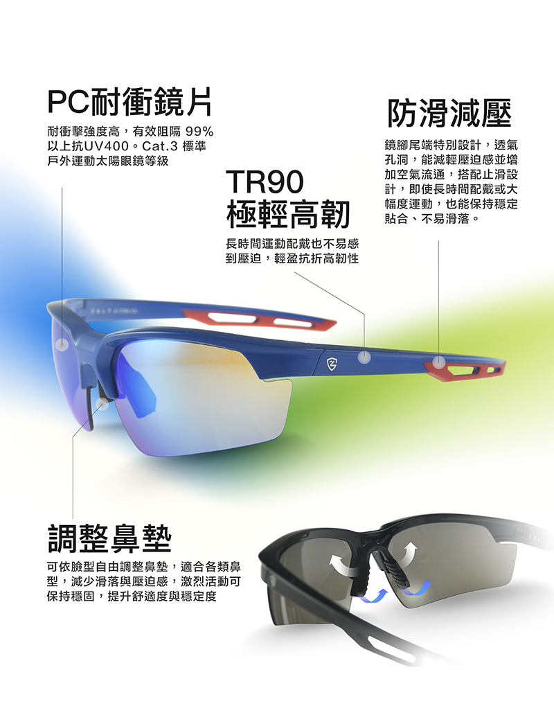 • 鏡片材質:PC 耐衝擊鏡片,有效阻隔 99% 以上 UV