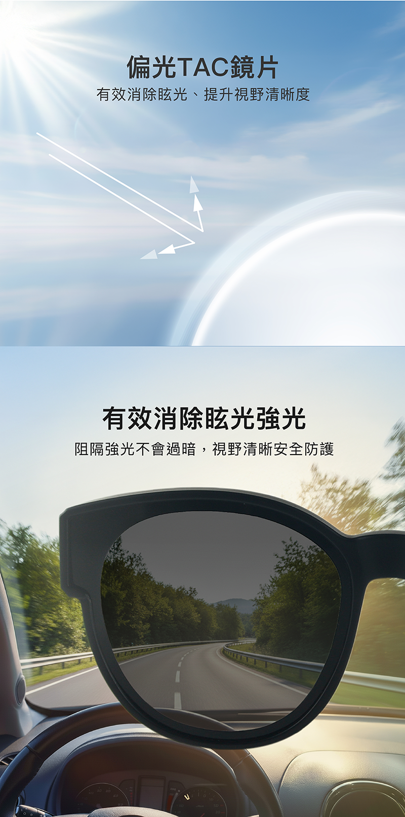 - 鏡片材質:偏光 TAC 鏡片,有效消除眩光與反射光,提升視覺清晰度