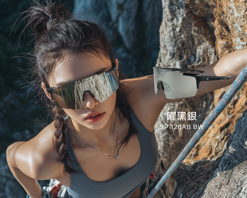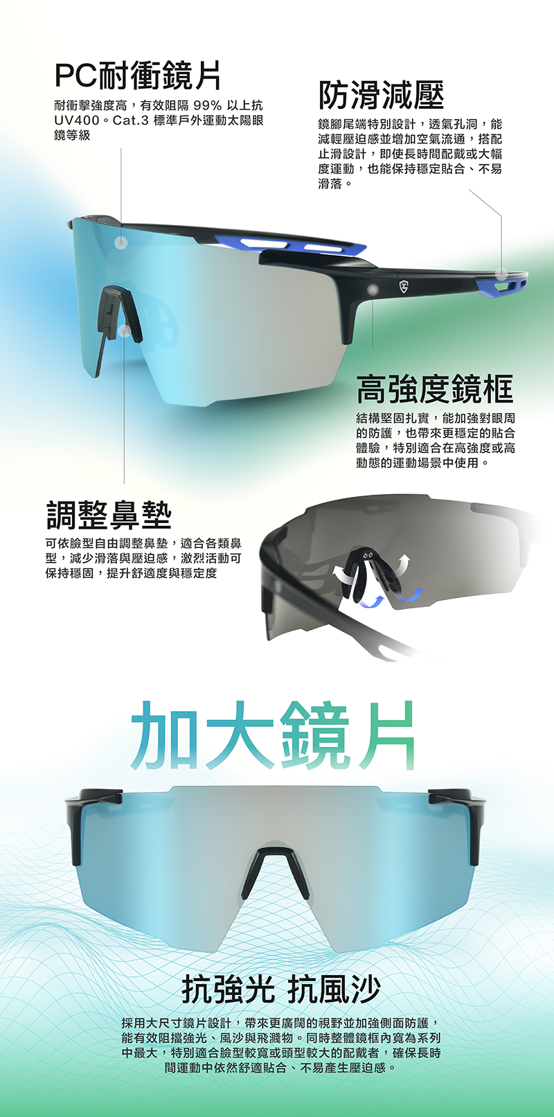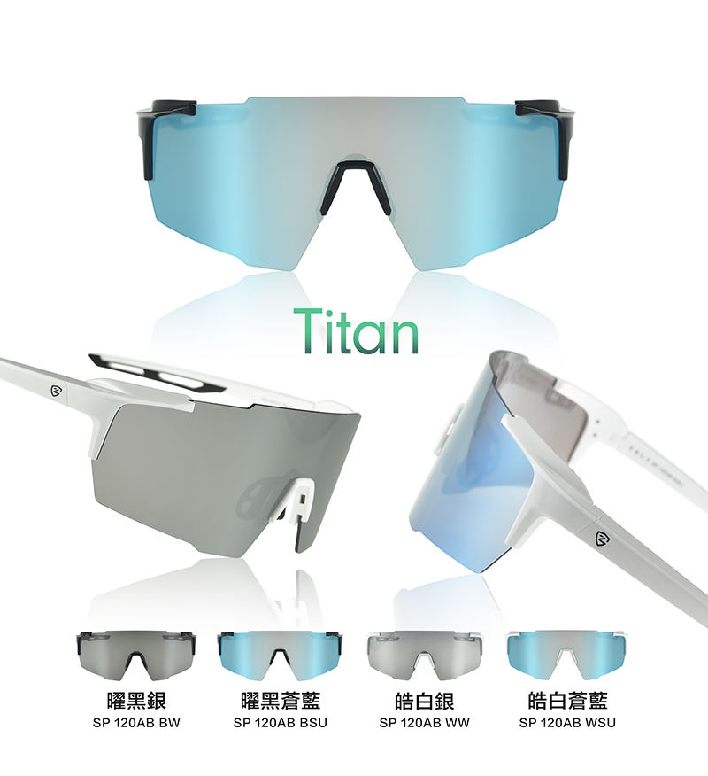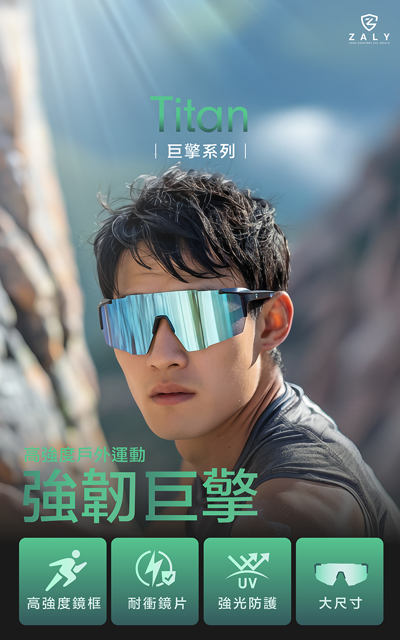 Titan 巨擎系列運動太陽眼鏡,採用 PC 強韌鏡框與 PC 耐衝擊鏡片,搭載 Cat.3 戶外運動等級濾光與 99% 以上 UV 阻隔,適合登山、越野與高強度戶外使用。加大鏡片與寬版鏡框,高包覆、高防護,特別友善寬臉與頭型較大的配戴者,穩定不易滑落。