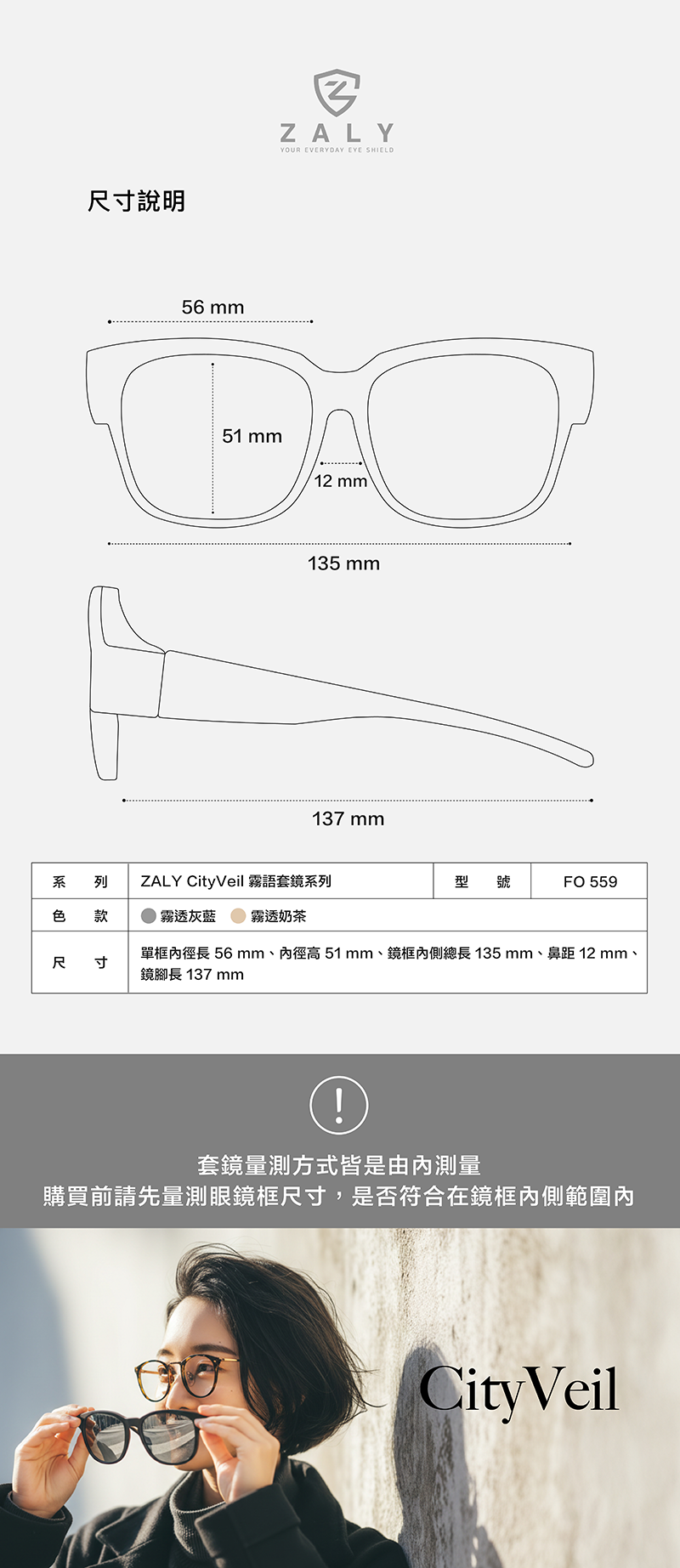 尺寸:單框內徑長56mm、內徑高51mm、鏡框內側總長135mm、鼻距12 mm、鏡腳長137mm